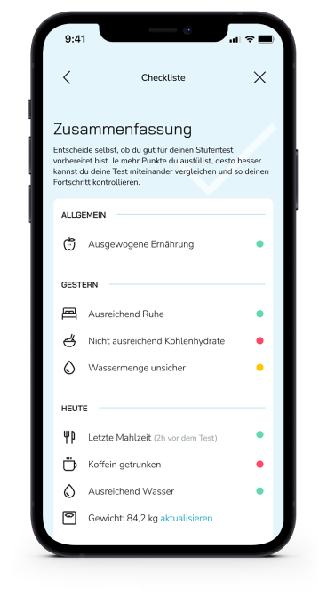 Um einen validen Stufentest zur Leistungsdiagnostik durchführen zu können, solltest du dich an bestimmte Rahmenparamter vor dem Test halten. Diese kennst du wahrscheinlich schon von deinen Tests beim Sportmediziner. Hiermit prüfen wir, ob Du gut auf den Test vorbereitet bist und vergleichbare Voraussetzungen zu deinen vorherigen Tests hast.
