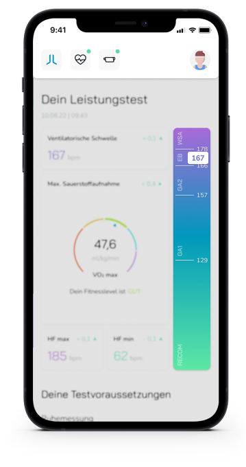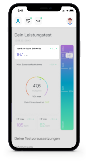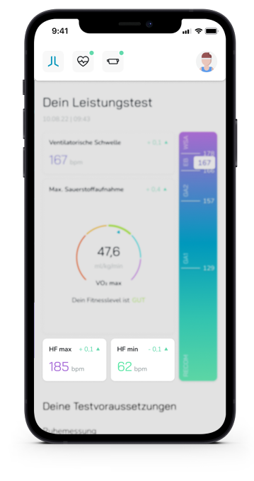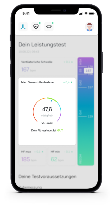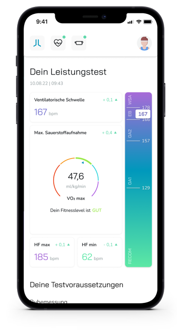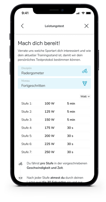 Wir haben für den LactoLevel ein eigene Stufentestprotokolle sowohl für Rad-, als auch Lauftests entwickelt, damit die maskenfreie Messung so einfach wie möglich gelingt. Die App zeigt dir nach dem Test folgende Werte an:
